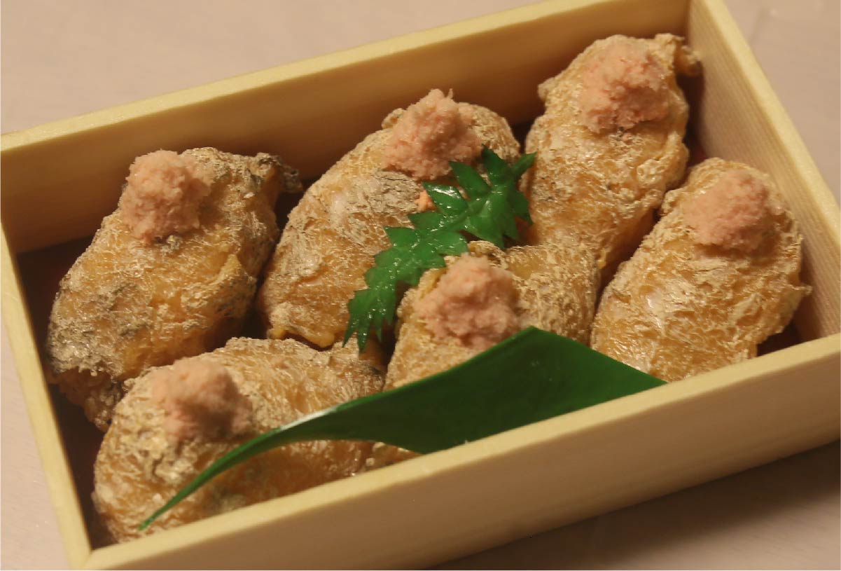 揚げを煮るときは非常に強いだしで煮ます。揚げを裏返しにすることで、口あたりが良くやわらかい食感となり、噛んだ瞬間ジュワっとだしが染み出て広がっていきます。薄口ではありますが、だしが活きた深く奥行きがある味です。見た目もかわいい心が和むような一品となっています。